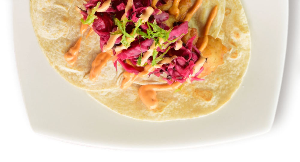 Ricos camarones rebozados, sobre 2 tortillas de harina acompañados de col morada encurtida y aderezo de chipotle.