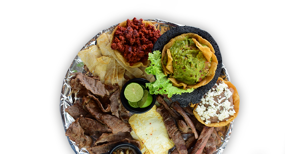 Mix de carnes: Arrachera, bistec de res, bistec de pollo, longaniza, queso panela asado, acompañado de guacamole y frijoles refritos.