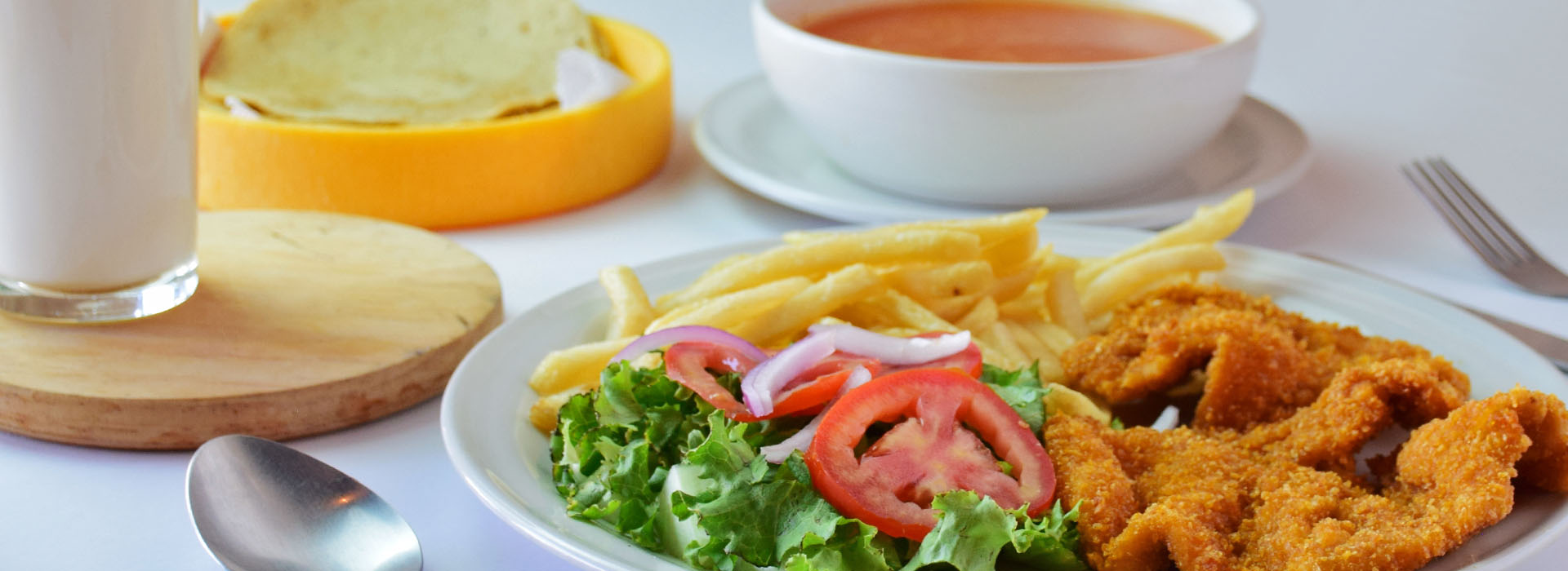 Rica pechuga empanizada acompañada de papas a la francesa y salsa de cátsup.