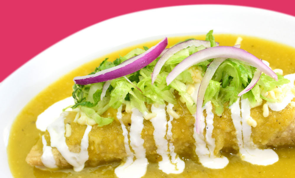 4 tortillas de maíz fritas rellenas de pollo, bañadas en salsa de su elección, acompañadas con crema, queso y cebolla. Enchiladas de mole