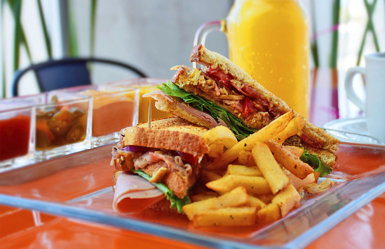 Pan Oroweat, mayonesa, lechuga, jitomate, jamón, queso asadero, pechuga a la plancha, frijoles, tocino horneado, acompañado de papas a la francesa.