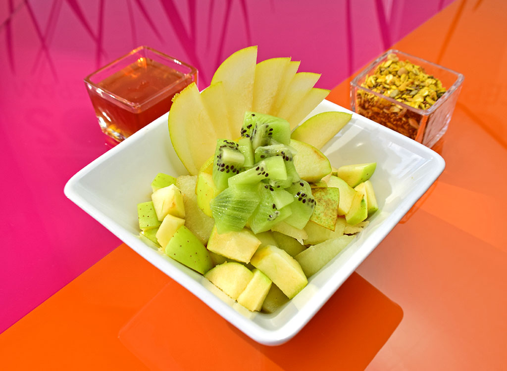 Mezcla de manzana verde, kiwi, melón chino verde, pera, uva verde, granola y miel de abeja.